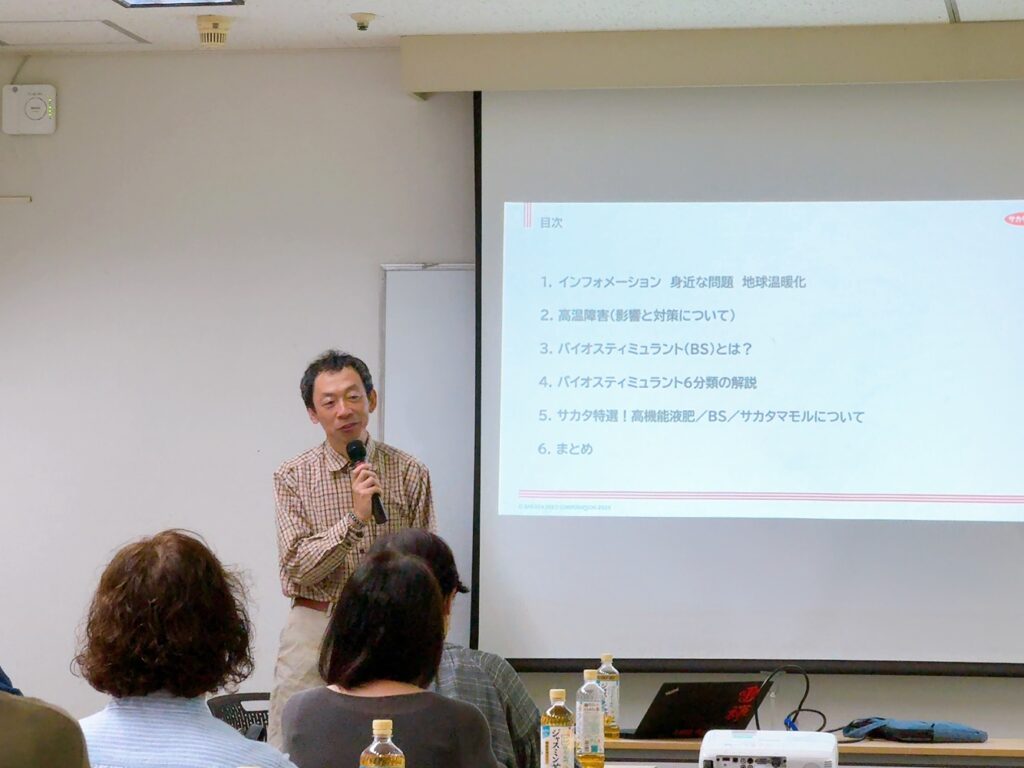 今回の特別講座では、サカタのタネの高木篤史さんをお招きし、気候変動が進む中で注目されている「高温障害」への具体的な対策と、「バイオスティミュラント(BS)」の活用方法について学びました。